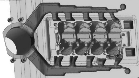 1.單側進澆優缺點: 1)優點:單側進澆由于鋁水從一側往另一側順序填充,在天側滑塊設置大的排氣和真空,對于整個填充過程的排氣排渣效果相對較為有利; 2)優點:單側進澆往往會選擇特征較為復雜的主油道測進行入料,所以通常主油道等關鍵區域附近質量相對較好,此點也符合關鍵區域優先進料的澆排設計原則; 3)缺點:如上述由于缸孔對于流態的阻隔,單側進料鋁水的填充通道只有曲軸部位,這相當于將天側面分割成了幾塊,然后鋁液在天側面進行交匯;如果以缸孔為中心,這勢必造成天側面的成型質量要整體差于進料測,所以此種進料方式整個產品的致密性是按照進料方向遞減的;遠端存在縮孔而發生泄露的問題往往無法解決,只能通過浸滲來降低泄露率; 4)缺點:正因為存在上述問題,單側進料往往需要更大的速度和壓力來彌補填充通道的不足,這也間接降低了模具壽命,至少是進料側的壽命;
