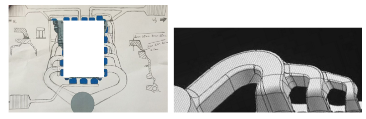 2.上述填充順序的澆口設計:要嚴格控制上述的填充順序和梯度,重點是要對每個內澆口尤其是前兩個內澆口的入料導向,鋁液流動是往背壓小的區域優先填充的,內澆口厚度小,所以通常大部分鋁液會優先充滿主澆道然后再往內澆口逐個填充,所以導向設計首先要克服背壓這個問題; 原理其實也很簡單,就是利用圓周運動的離心力,當高速圓周運動的物體脫離束縛后是沿著脫離點的圓周切線方向運動的;所以此類澆排的核心就是利用這一原理對前幾個澆口進行導向設計,如圖所示: