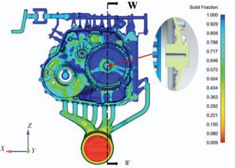 圖7 凝固時間t=9.880 7 s固相分數圖,橫截面W選取位置示意圖