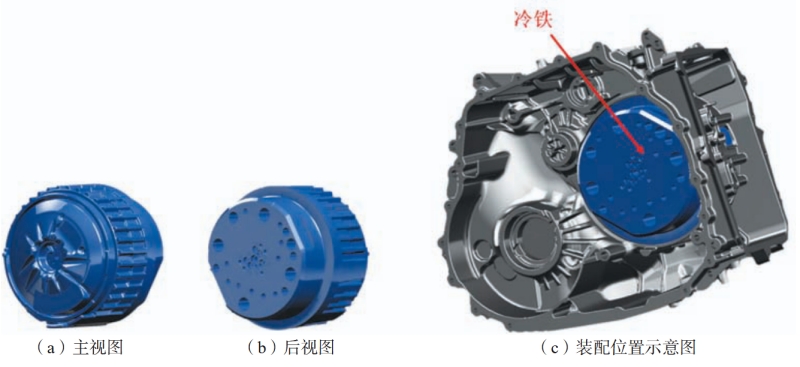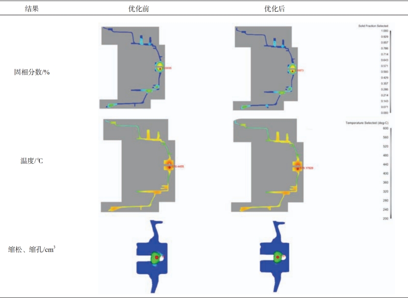 表4 正交試驗結果匯總表 采用極差分析法分析正交試驗的結果表明,模具預熱溫度影響最小,澆注溫度影響最大,壓射速度與壓射比壓的極差在其二者之間。因此,分析得出最優的工藝參數方案為A3B4C2D4,即澆注溫度675 ℃、壓射速度3.5 m/s、模具預熱溫度210 ℃和壓射比壓85 MPa。根據計算,優化后鑄件缺陷體積為17.139 2 cm³,比表4正交試驗中的任何一組數據的缺陷體積都要少,因此可以判斷,優化工藝參數可以有效地減少鑄件的缺陷體積。 2.4 特殊部位結構優化 根據圖5中鑄件的凝固過程以及圖7凝固過程中的固相分數分析,發現鑄件底部厚大區域在凝固過程中的溫度明顯高于鑄件其他部位,其凝固過程也落后于整體。這是因為該部位壁厚較大且存在較多孔洞,結構較為復雜,形成了熱節區域,冷卻速度較慢。若凝固過慢,導致沒有及時得到周圍金屬液的補縮,則會形成孤立的液相區,縮松縮孔等缺陷極易出現。因此,如圖8所示,若根據鑄件形狀在此處設置冷鐵,可以降低該區域整體溫度,加快金屬液的冷卻,達到同時凝固的效果,使鑄件整體凝固時的溫度趨于平衡。