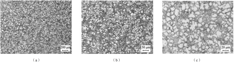 圖9 厚大區域金相圖 2.5 鑄件組織性能分析 在鋁合金殼體的鑄造過程中,不同結構處由于壁厚不同,凝固順序與冷卻過程也存在著差異,因此選取并觀察了鑄件出現缺陷風險較高、冷卻時間不同的六個特征位置(a溢流槽、b孔洞、c薄壁、d澆口、e厚大區域和f凸起),如圖10所示。殼體組織主要以α-Al與共晶Si為主,各區域都是等軸晶,其中共晶Si分布在α-Al周圍。初生α-Al相在圖中表現為兩種形式,分別為凝固過程中冷卻速率較低所形成較大的α-Al?,與冷卻速率較高所形成的較小的α-Al?。根據晶粒尺寸分布圖可以看到,溢流槽處,如圖10(a)所示,平均晶粒尺寸最大,且存在著較多尺寸較大的α-Al?相。底部厚大區域,如圖10(e)所示,平均晶粒尺寸最小,為較小的α-Al?相。其余孔洞、薄壁、澆口以及凸起區域晶粒尺寸相差不大,且多為尺寸較小的α-Al?相。