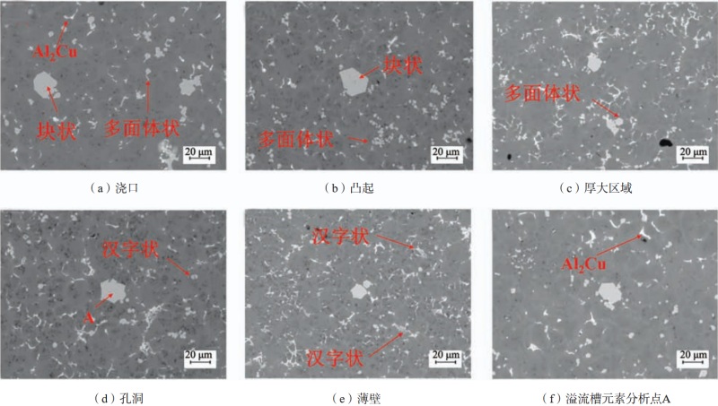 圖10 金相試樣選取位置示意圖、金相圖以及各位置晶粒尺寸分布圖 金屬液在到達鑄件靠近的溢流槽區域時,溫度有所下降,受最先開始凝固的排氣管道、溢流槽區域所放出的大量熱量的影響,金屬液凝固較緩慢,晶粒有足夠時間長大并形成圖中較大的α-Al相,如圖10(a)所示。而凸起處,如圖10(f)所示,較早完成充型,結合凝固溫度圖(圖5)顯示,該區域冷卻速率較高,較早開始凝固,且充型結束時溫度接近液相線,因而過冷度較大,形核率上升,使得晶核間的相互抑制作用增強,抑制了晶粒的長大,最終形成了晶粒尺寸相對較小的球狀或顆粒狀的α-Al相。 厚大區域金相如圖10(e)所示,本身由于壁厚較大,冷卻緩慢,但合金在凝固過程會受到冷鐵的影響使得冷卻速率增加,從而獲得更大的過冷度,因此凝固后α-Al晶粒尺寸較小。圖10(b)為孔洞區域金相組織圖,該區域靠近冷鐵,冷卻速率增大,也獲得了較大的過冷度,在α-Al的形核生長的過程中,Si原子不斷向液相擴散,在凝固前沿出現富集,從而生成了較多的共晶Si。 圖10(c)與圖10(d)分別為薄壁處與澆口處金相組織圖,兩處區域壁厚較薄,在充型結束后易受到較低的模具溫度的影響加速冷卻,過冷度相對增加,形成尺寸較小的α-Al晶粒。 為進一步探究不同位置的顯微組織結構的區別,采用掃描電子顯微鏡及電子探針分析了六個區域的形貌及化學成分,分別如圖11所示。由于薄壁部位壁厚較薄,因而對鑄件該區域的力學性能以及組織結構有著更高的要求,故對薄壁區域試樣通過電子探針面掃描分析其元素分布情況,并對其組織結構進行了觀察,如圖12所示。