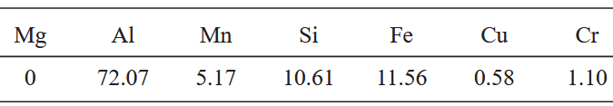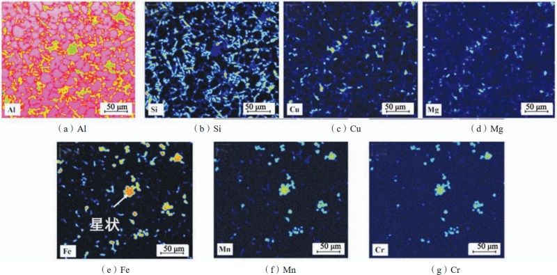12 EPMA面掃描結果 如圖11和圖12所示,Si元素分布在α-Al基體周圍,Mg元素與Cu元素分布規律近似,分布在α-Al相周圍的Si基體中,而Fe、Mn和Cr則更多地富集在一起。如圖12所示,Mg的含量較少(如表1所示,加入量在1.0%以下),多分布于共晶Si相與α-Al的交界處,起到細化共晶Si、促進材料內部合金元素擴散、提高材料的力學性能的作用。在合金中還觀察到高密度的較亮化合物(圖11(a)、(f)),它們以細片的形式與α-Al相形成共晶結構,形成Al? Cu相。Al?Cu相以片狀和塊狀顆粒的形式出現,研究表明,片狀Al? Cu相較塊狀硬度更高,具有更好的強化效果。 在顯微組織中還能觀察到多種大小不一的相,包括塊狀、多面體狀、漢字狀以及星狀,如圖11以及圖12(e)。根據圖12元素含量分析判斷,該相含有較多的Fe、Mn、Cr、Al以及Si元素,初步判斷為某種α-Alx(Fe,Mn,Cr)ySiz相,這些第二相是合金中的Fe元素達到一定含量時,而產生的富鐵相。 研究發現,這種富鐵相在鐵含量大于0.6%的鑄件中會被廣泛發現,為α-AlFeMnSi相。根據EPMA分析,對圖11(d)中的A點進行成分分析得到結果如表6,確定其成分為Al??(Fe,Mn,Cr)? Si?。此外,凝固環境,特別是冷卻速率的變化對該富鐵相凝固過程的影響較大。隨著冷卻速率的增加,富鐵相的大小和體積分數減小。而當添加了足夠的Mn,即當Mn/Fe比例大于0.5,且Fe含量小于1.2%時,有利于含鐵相轉變為α-Fe相,減少針狀β-Fe的形成,改善合金的延展性。Cr元素的加入,促進了塊狀、星狀富鐵相的形成。星狀和塊狀富鐵相的硬度遠高于Al基體,漢字狀的硬度略低于塊狀、星狀富鐵相的硬度。因此,這些塊狀、星狀富鐵相的出現有助于提高材料的硬度。綜合金相圖和SEM觀察,鑄件中未發現β-Fe相,α-Fe相在Mn和Cr的影響下更多地轉變為有利于提升鑄件性能的塊狀和星狀富鐵相,其性能更好。而在性能要求較高的薄壁區域,鑄件整體組織、析出相分布也更加均勻。