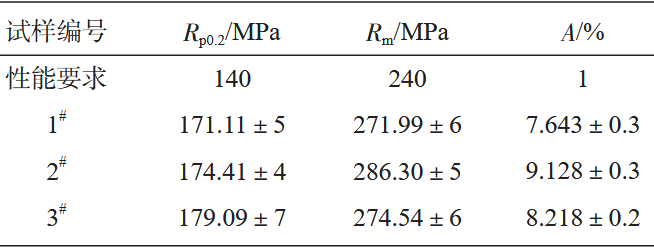表6 A點EPMA分析各元素原子百分比 at.% 鑄件的力學性能測試結果如圖13以及表7所示,其中1 #、2 #與3 #數據分別為溢流槽區域、底部厚大區域以及澆口區域各取三個試樣獲得的平均值,根據表中數據顯示,鑄件整體的力學性能優異,各指標均滿足并高于鑄件技術要求。因而綜合鑄件微觀組織與力學性能測試可以判斷該工藝下的鑄件有著均勻的微觀組織與良好的力學性能。