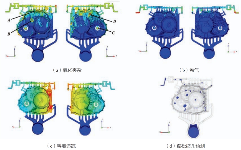 圖5 真空壓鑄鋁合金殼體的凝固過程 2.2 缺陷分析 圖6為缺陷分析。如圖6(a)、(b)所示,在充型過程中,溢流槽A與C、凸起B以及孔洞C極易出現氧化夾雜缺陷,且存在一定的卷氣風險。圖6(c)顯示了充型時不同澆口料液的流向,圖6(d)為縮松和縮孔缺陷預測。綜合圖6所示的各項缺陷分析可以發現,易產生缺陷風險的位置多為不同股的料液交匯處,因此壓射比壓以及壓射速度將會是影響最終成品質量的重要因素。