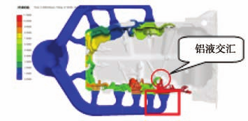 圖2 局部厚大位置剖視圖 由于該油底殼內腔為產品頂出位置,因此內腔以動模成形,方便產品頂出,減小包緊力的作用,從而保證產品的平面度;且濾清器安裝面、放油螺栓孔及后端面為3組滑塊所在位置,如圖1(b)。故依據該油底殼結構選定分型及進料方式如圖3所示:整體進料方式為豎直進料,以油底殼前端面為進料位置,可以避免分流錐設置在滑塊上容易卡死的風險。共設計10組內澆道進料,后端面為填充末端。對該澆注系統進行初始數值模擬,模擬結果顯示,鑄件充型完成時整體溫度偏低,如圖4所示。原因為澆注系統流程長,充型過程中熱量損失大,充型末端容易形成冷料聚集,從而導致加工后氣孔、夾渣缺陷增多。且底部兩股流道優先進料,容易形成冷隔,導致拋丸后起皮,如圖5所示。
