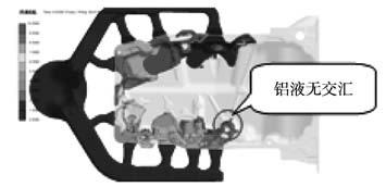 圖8 油底殼缺陷解剖圖 高壓油道孔泄漏問題為內部縮孔導致,部分泄漏產品縮孔外露導致裂紋產生,油道位置為產品熱節所在,油道鑄銷高壓點冷無法完全冷卻該位置,使用熱成像儀對該位置模具溫度進行檢測,油道鑄銷位置整體溫度近290 ℃,如圖9所示。通過調整鑄銷高壓點冷通水流量,延長通水時間,無明顯改善效果,初步判斷存在其他影響因素。通過反復確認CAE模擬結果,發現油道鑄銷正處于操作側末端兩股流道交匯處,如圖10所示,兩股流道直沖油道鑄銷且融合不良,從而導致鑄銷溫度過高產生縮孔甚至縮孔外露。