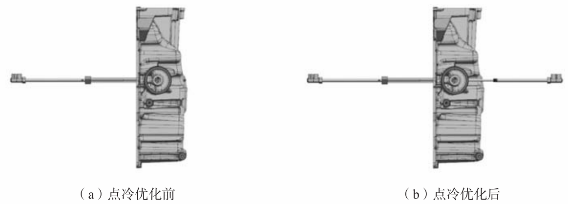 圖11 改善后模具溫度場 依據缺陷所在對模具進行優化調整,將操作側最末端一股流道進行封堵,如圖12所示,同時,在定模芯新增一組高壓點冷對高壓油道孔底部壁厚位置進行點冷,加強熱節位置的冷卻,如圖13所示。