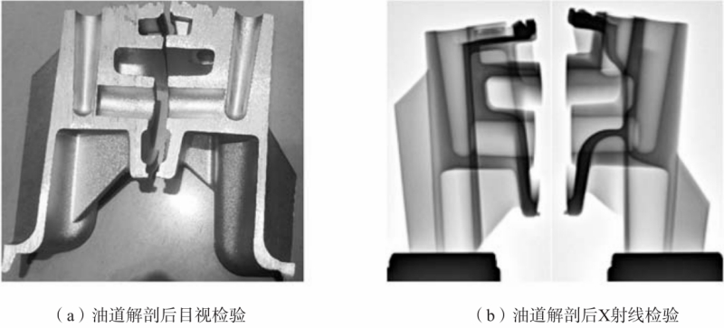 圖13 模具點冷方案優化 優化后油道位置模具溫度降至170 ℃,進行批量生產驗證,試壓無泄漏及裂紋出現。鑄件外觀明亮,無冷隔、流痕等缺陷存在,拋丸處理后表面粗糙度符合要求,無明顯拋丸起皮現象,如圖14所示。對產品進行X光射線檢驗,內部質量良好,整體孔隙滿足ASTME505 2級標準要求,如圖15所示。油道位置解剖后對該位置剖面及內部進行針對性檢驗,無明顯氣孔、縮孔存在,如圖16所示。按此工藝進行批量生產,泄漏料廢率0.48%,產品綜合合格率達到98%以上,滿足批量生產要求。