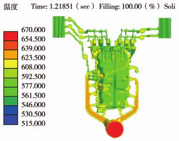 圖7 壓室充型模擬結果 依據模擬結果顯示,鋁合金液在壓室內溫度始終保持在液相線+30 ℃以上,且低速充型過程中,隨著沖頭向前推進,鋁液充型平穩,無卷氣現象產生,避免了壓室內氣體的卷入。 3.2 快壓射速度的選擇 快壓射速度選擇的原則:(1)鋁合金液在充滿型腔前必須具有良好的流動性,保證充型的順暢;(2)使鋁合金液能快速有序地充滿型腔,并把氣體排出到型腔外;(3)不形成高速的金屬流沖刷型腔或型芯,避免粘模現象的產生,鋁合金壓鑄件內澆道速度一般為40~60 m/s。油底殼鑄件內澆道總截面積為771mm²,壓室截面積為9498.5mm²,初步選定內澆道速度為50m/s ,依據伯努利方程:內澆道速度×內澆道截面積=高速速度×壓室截面積,計算得出高速速度為4m/s。 3.3 高速切換位置的選擇 壓鑄件理論高速切換位置為金屬液填充至內澆道位置,該油底殼鑄件理論高速位置為590 mm,但由于內澆道為上下排列,底部的內澆道會提早進料,導致鑄件底部位置出現冷隔問題,故將高速切換點設置為550 mm,具體壓鑄工藝參數見表1。