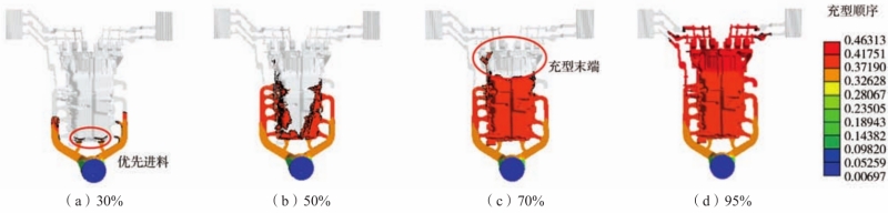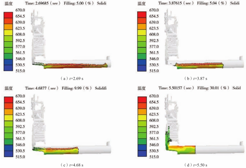 圖5 充型過程示意圖 底部及兩側流程過長,鋁液在流道內熱量損失的問題可以通過適當提高內澆道的充型速度,從而提高鋁液進入型腔的溫度,依據公式(1):