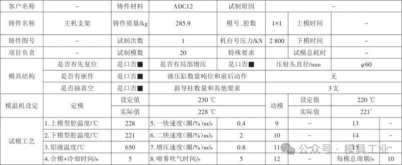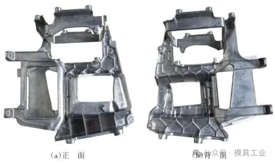 圖9 模具結構 1.壓室 2.分流錐 3.定模板 4.動模板 5.墊塊 6.支撐柱 7.推板 8.推桿固定板 9.復位桿 10.斜導柱 11.型芯鑲件 12.型腔板鑲件 13.彈簧 14.拉桿 15.滑塊 16.滑塊 17.滑塊 3.2 模具成型零件 型芯鑲件11、型腔板鑲件12、滑塊15~17都采用進口合金鋼8418制造,8418模具鋼是一種含鉻、鉬、釩的高性能熱作模具鋼,具有較好的抗熱疲勞龜裂、熱沖擊開裂、熱磨損、塑性變形的性能,這些性能使其成為壓鑄、熱鍛、熱擠壓模用鋼的最優選擇。模具零件粗加工后熱處理前須進行去應力處理,淬火硬度為46~48 HRC。模具零件加工完成后,對型芯、型腔板鑲件進行噴丸強化處理,噴丸強化處理是專門針對壓鑄模零件的表面處理技術,其主要目的是提高模具零件的耐磨性、抗腐蝕性和熱疲勞性能,以延長模具的使用壽命。型芯及型腔板鑲件外形尺寸應比動、定模框小0.05~0.08 mm,四角定位配合公差為0.03~0.05 mm。 3.3 鑄件成型 模具裝配及經過質檢合格后,且保證開合模各個動作(開合模、推出等)順暢后試模,根據鑄件信息及壓鑄機參數,設定第1次試模參數,如表2所示,第1次試模樣件,如圖10所示。 表2 試模報告