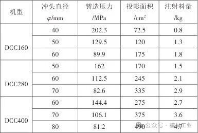 圖3 成型難點分析 2.2 成型設備匹配 鑄件質量為285.9 g,成型投影面積為16 935 mm²,結構復雜,型腔末端充填困難,模具需設計多滑塊抽芯。鑄件的強度要求高,需要較高的鎖模力以及壓力,結合壓鑄機參數(見表1所示),選定DCC280T冷室壓鑄機為成型設備,配備直徑φ60 mm的沖頭。 表1 壓鑄機參數