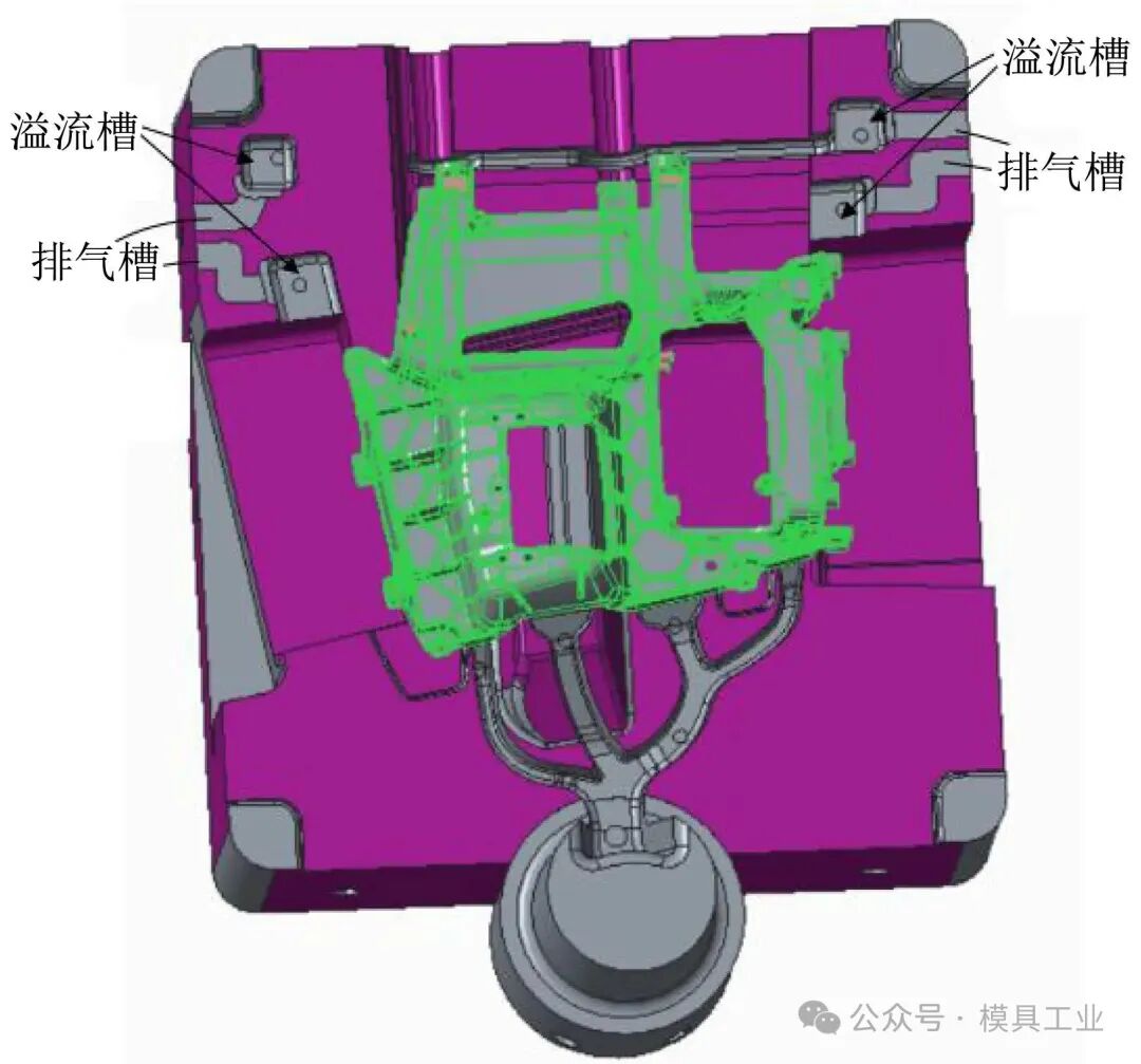 圖5 澆注系統設計 針對4股流道進料及鑄件籠式加強筋結構易引起多股料流在交匯處產生冷料的問題,如不能及時將冷料排出型腔,會導致鑄件表面產生冷隔紋,內部引起縮孔、困氣等,甚至影響其強度導致斷裂,因此在型芯側設計了4個25 mm×25 mm×12 mm溢流槽和4個12 mm×0.1 mm排氣槽,如圖6所示。在型腔頂部加強筋內側設計了25 mm×25 mm×5 mm溢流槽,其側壁脫模斜度為30°,底部倒R3 mm圓角,靠溢流槽內澆口帶出成型鑄件,為了順利帶出成型鑄件,內澆口尺寸設計為20 mm×1 mm,用于及時排出流道2、3交匯的冷料。在型芯對應的型腔板位置也開設相應的溢流槽以增加排渣的容量,如圖7所示。
