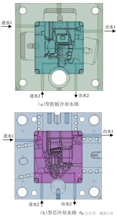 圖7 型腔溢流槽 冷卻系統設計中壓室采用雙循環水路,以確保冷卻效果,提高沖頭的耐用性,分流錐采用水井冷卻設計,型芯及型腔板各布置2條直徑為φ8 mm的水路,如圖8所示,距離鑄件為25 mm,水路接頭采用1/4PT管牙,所有冷卻水管穿過模架直接鎖在型芯和型腔板側面,這樣能有效防止因使用密封圈老化而出現漏水現象。