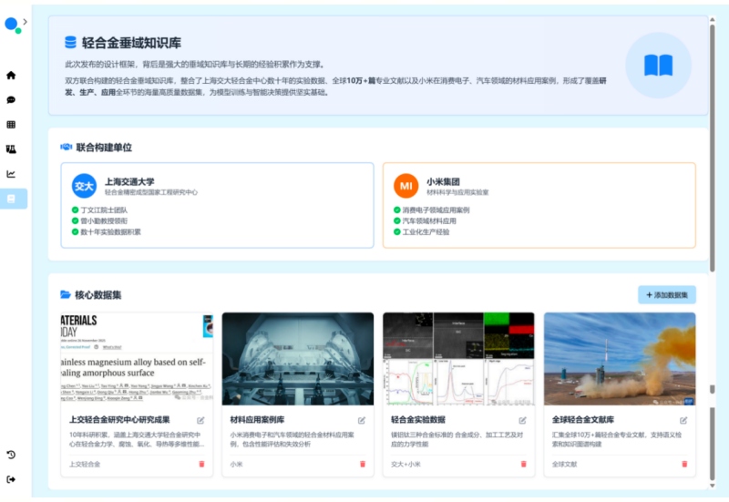 ![]() 輕合金材料在航空航天、汽車、消費電子等領域具有廣闊的應用前景,其突破性創新已成為全球高端制造競爭的核心焦點。針對輕合金材料設計方法面臨的組分工藝復雜、研發生產應用流程長,評價維度多樣等難點,上海交通大學正式聯合小米集團發布輕合金大模型多智能體設計平臺,構建AI驅動輕合金全鏈條智能研發體系,助力輕合金材料研發范式變革。 組分工藝復雜:DeepLight推理驅動,重構輕合金研發范式 輕合金材料組分工藝復雜,其研發長期依賴傳統實驗試錯,一款高性能合金材料的研發需要以年為單位的時間。輕合金大模型DeepLight以垂域知識推理為驅動,大幅提升輕合金研發效率,將輕合金設計推向人工智能驅動的"第五范式"。 針對輕合金“成分—工藝—性能”關系強耦合、跨尺度機理復雜導致的外推預測難、推理難度高等行業關鍵瓶頸,團隊構建了面向輕合金特性的鏈式推理數據體系。該體系融合材料組分、微觀結構、相變行為、組織演化與力學性能等多維度知識,通過監督微調與強化學習技術,使模型能夠穩定構建跨尺度推理路徑、捕捉復雜的非線性結構—性能關系,從根本上提升了輕合金垂域的推理質量。 團隊依托DeepLight的推理能力,已成功研制出超強耐蝕鎂合金,其耐腐蝕性能達到目前公開報道中的最佳水平,為鎂合金在汽車、航空等高要求領域的工程化應用打開了新的可能。 性能預測,點擊查看相關視頻 研發生產應用流程長:AgentMat多智能協作,驅動全流程設計革新 如果說DeepLight是輕合金研發的"智慧大腦",那么AgentMat多智能體協作框架就是打通全流程的"高效中樞"。針對輕合金研發生產應用流程長所帶來的前沿跟進困難、落地應用時模型專家協作困難等諸多問題,該框架將材料研發拆解為知識獲取、數據分析、方案生成、工具調用與驗證、專家協作等智能體,通過智能體間自動化的高效協作實現從研發到實際應用的順暢落地。 AgentMat的協作機制可以有機結合DeepLight模型、內部積累的小模型和理論預測工具、專家判斷與反饋等多維度信息,交叉驗證優化方案可行性。以鎂合金研發為例,AgentMat可在1小時內完成從需求分析到新設計方案輸出的全流程,并推送給材料科學家與工程師進行高效協同,較傳統模式效率提升10倍以上。目前,該框架已在智能體驅動的自動化合金實驗平臺完成初步部署,實現了"模型預測-實驗驗證-數據反饋"的AI自主閉環迭代,未來可快速適配到汽車、航空航天等領域的實際生產場景中。 【智能設計】實驗報告生成,點擊查看相關視頻 【智能設計】配方結果生成,點擊查看相關視頻 缺乏評價指標:LightAlloy-Bench評測基準,樹立輕合金設計方法度量衡 輕合金評價維度多樣,其設計方法缺乏統一、權威的評測標準。上海交大輕合金中心依托其在領域的深厚積淀,構建了國內首個覆蓋鎂、鋁合金全場景的專業評測基準,為輕合金材料AI模型提供了科學、精準的"度量衡"。 該評測基準LightAlloy-Bench面向輕合金大模型能力驗證,涵蓋材料基礎知識掌握與性能推理兩大維度、多項關鍵指標。研發團隊不僅系統整合了丁文江院士、曾小勤教授領銜的輕合金精密成型國家工程研究中心團隊長期積累的研究數據,還廣泛收集了輕合金領域近20年的公開文獻數據,構建了業內首個覆蓋體系最全、知識鏈最完整的輕合金領域評測數據集。DeepLight在該評測集上取得了最優表現,較DeepSeek-V3與GPT-4o通用大語言模型提升近 20%,展現出在輕合金知識理解、機理推斷與性能預測任務上的顯著優勢。
