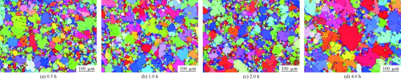 圖2 不同固溶時(shí)間下半固態(tài)壓鑄Al-Si-Fe-Mg合金的EBSD結(jié)果