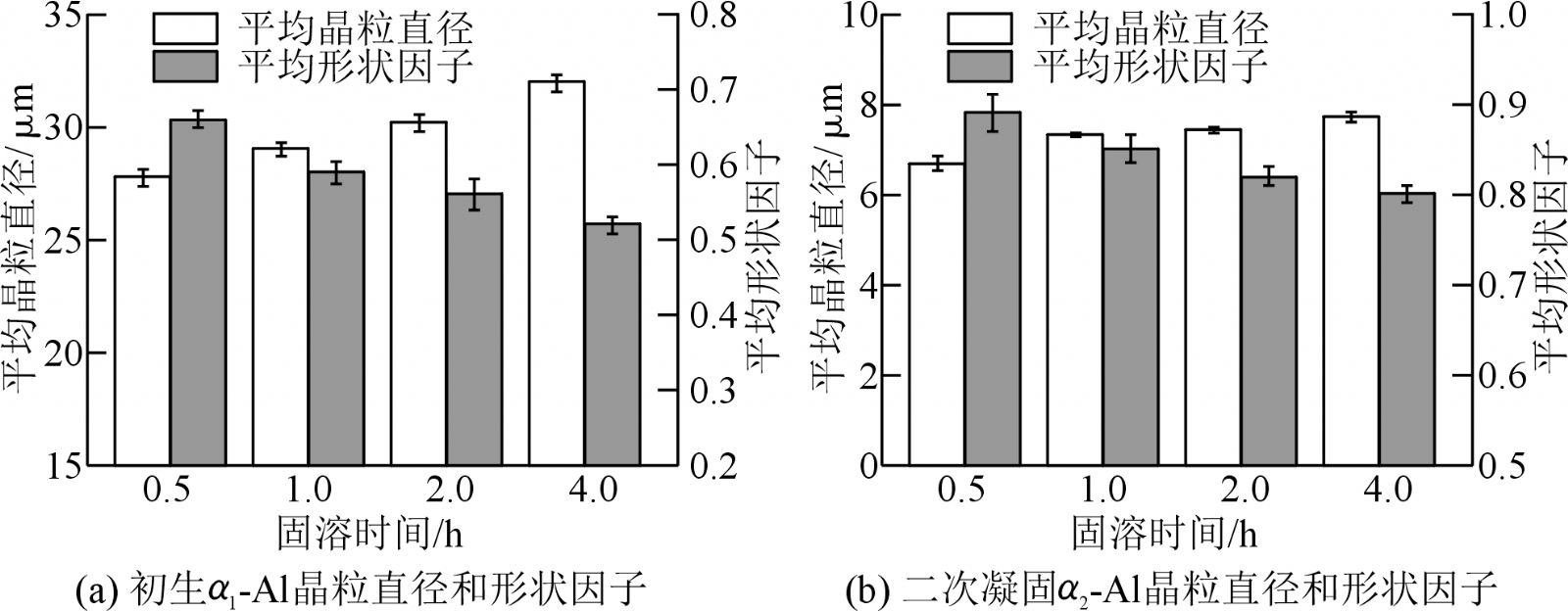 圖1為半固態(tài)壓鑄Al-Si-Fe-Mg合金的顯微組織、EDS分析、EPMA組織及Fe含量。 圖2為不同固溶時(shí)間處理的半固態(tài)壓鑄Al-Si-Fe-Mg合金的EBSD組織。可以看出,不同固溶時(shí)間處理的合金組織中的α-Al晶粒均由大尺寸的初生α1-Al晶粒和小尺寸的二次凝固α2-Al晶粒組成。基于EBSD結(jié)果,對初生α1-Al晶粒和二次凝固α2-Al晶粒的直徑和形狀因子進(jìn)行統(tǒng)計(jì),見圖3。