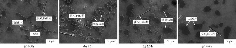 圖4 不同固溶時(shí)間下半固態(tài)壓鑄Al-Si-Fe-Mg合金的SEM組織