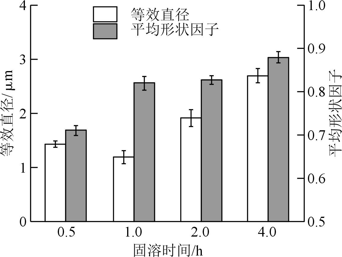 圖3 固溶時(shí)間對半固態(tài)壓鑄Al-Si-Fe-Mg合金顯微組織的影響 圖4為固溶處理后半固態(tài)壓鑄Al-Si-Fe-Mg合金的SEM組織。可以看出,當(dāng)固溶時(shí)間為0.5 h時(shí),共晶Si相由短棒狀以及顆粒狀共晶Si相組成,共晶Si相出現(xiàn)頸縮現(xiàn)象,頸縮的共晶Si相發(fā)生溶斷并破碎成小的共晶Si相,見圖4a。當(dāng)固溶時(shí)間增加至1 h時(shí),共晶Si相為顆粒狀形貌,見圖4b。隨著固溶時(shí)間繼續(xù)增加,顆粒狀共晶Si相長大,見圖4c和圖4d。對比共晶Si相的等效直徑和形狀因子發(fā)現(xiàn),當(dāng)固溶時(shí)間從0.5 h增加至4 h時(shí),共晶Si相的等效直徑先減小后增加,形狀因子持續(xù)增大,見圖5。