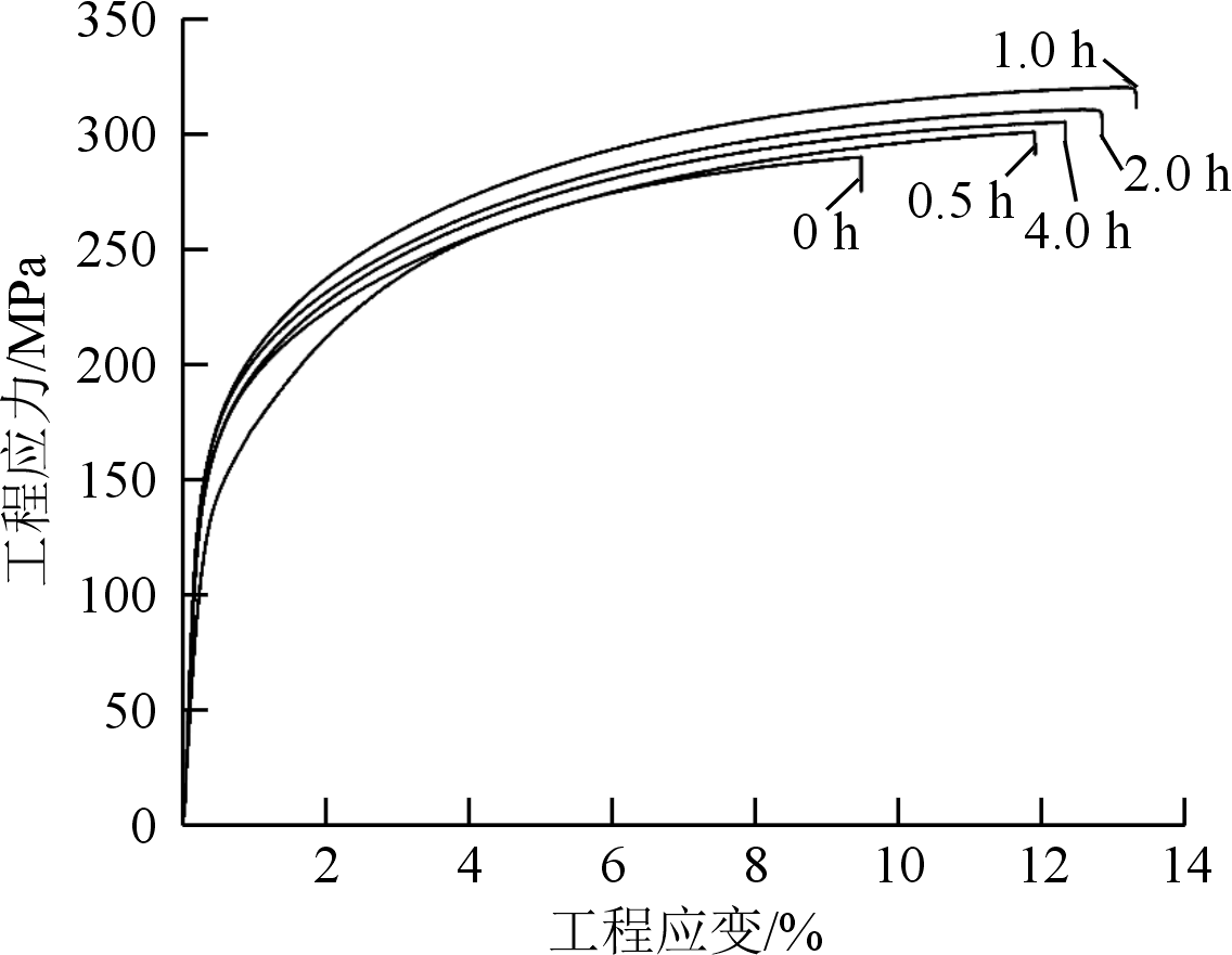 圖5 不同固溶時(shí)間處理對合金中共晶Si相的等效直徑和形狀因子的影響 圖6為不同固溶時(shí)間下半固態(tài)壓鑄Al-Si-Fe-Mg合金的EPMA組織。基體中溶質(zhì)原子的固溶度分析結(jié)果見表2。結(jié)果表明,當(dāng)固溶時(shí)間為0.5 h時(shí),部分Si和Mg元素溶于基體,Cu元素幾乎完全溶于基體。隨著固溶時(shí)間延長至1 h時(shí),Si和Mg元素在基體中的固溶度增加。隨著固溶時(shí)間繼續(xù)延長,Si和Mg元素在基體中的固溶度保持不變。 圖7為不同固溶時(shí)間下半固態(tài)壓鑄Al-Si-Fe-Mg合金的工程應(yīng)力-應(yīng)變曲線。可以發(fā)現(xiàn),隨著固溶時(shí)間從0 h延長至4 h,合金的抗拉強(qiáng)度、屈服強(qiáng)度和伸長率均先增加后降低。當(dāng)固溶時(shí)間為1 h時(shí),合金的力學(xué)性能最優(yōu),其抗拉強(qiáng)度、屈服強(qiáng)度和伸長率分別為320.1 MPa、224.2 MPa和13.3%。