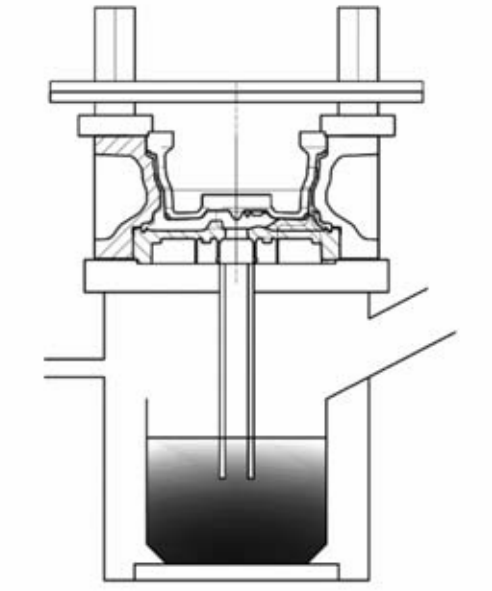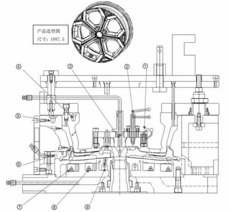 ![]() 原標題:低壓鑄造鋁合金車輪模具水冷結構設計 摘要 低壓鑄造模具冷卻結構由風/水霧冷改為水冷,研究了冷卻對模具鑄造的影響。結果表明,水冷結構不同,作用位置不同,冷卻效果不同。根據模具結構特點,合理布置水冷結構、分布,有效提高了鑄造效率和鑄件產品力學性能。 我國汽車鋁合金車輪的研究開發始于20世紀80年代末、90年代初期,生產方式有重力鑄造和低壓鑄造兩種。重力鑄造由于設備簡單,對工人的技術要求相對較低、投資小、生產轉換方便而得到廣泛應用。重力鑄造是鋁液依靠重力作用流動充填型腔,由于沒有外加壓力,為了獲得致密的鑄件,往往需要利用冒口來補縮。與低壓鑄造相比,重力鑄造的澆冒口較重,材料利用率很低,內部組織不致密。進入21世紀后國內汽車鋁合金車輪的生產,低壓鑄造逐步發展為主流生產方式。低壓鑄造是在一個密封的容器內,通入干燥的壓縮空氣,鋁液在氣體壓力的作用下沿升液管上升通過澆道進入型腔,并在保持氣體壓力的條件下完成凝固,然后卸除容器內的氣體壓力,使升液管和澆道中未凝固的鋁液回到容器中,已凝固的金屬在模具型腔中形成所需的鑄件。見圖1。