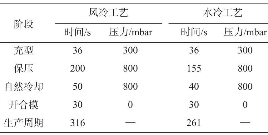 圖10 模具結構方案 上模共設計4道水冷:①點冷間接冷卻,與模具配合部位有導熱介質;②點冷直接冷卻;③中心點冷直接冷卻;④面冷直接冷卻。 邊模共設計2道水冷:⑤面冷直接冷卻;⑥面冷直接冷卻,采用電打孔工藝,杜絕漏水,且右側設有隔熱槽。 下模共設計3道水冷:⑦環形冷卻部件,與模具配合部位有導熱介質;⑧環形冷卻部件,與模具配合部位有導熱介質;⑨點冷直接冷卻,且內外兩側都設有隔熱槽。 4.2 生產效率及性能 現場工藝調整穩定后數據見表1。
