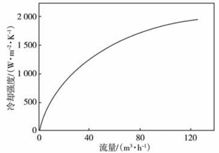 圖1 低壓鑄造示意圖 通過控制通入容器內的氣體壓力和加壓速度,可以控制鋁液在升液管中的上升速度和充型速度,因此低壓鑄造的鋁液充型平穩、易于控制。另外鑄件在一定的壓力下結晶凝固,鑄件的補縮效果好,鑄件的組織致密。而且低壓鑄造一般不設置冒口,澆注系統小,材料利用率很高。 01 低壓模具冷卻方式 為了達到鋁合金車輪鑄件的順序凝固和提高生產效率,常常對鑄造模具局部采取保溫措施或冷卻措施。模具的冷卻從發展之初主要有三種形式:風/水霧冷、水冷和冷鐵。 (1)冷鐵。鑄造工藝上有時在模具的局部位置使用冷鐵對鑄件進行激冷,以消除鑄件的疏松。常用的方法是在需要激冷的位置鉆孔加銅棒,因其冷卻強度和效果較差,在使用中存在一定局限性,未能大規模應用。 (2)風/水霧冷。先將金屬管進行彎制,裝配在模具背腔,使壓縮空氣通過風管直接噴射在需要冷卻的模具表面進行冷卻,由于其結構簡單、成本低、易于控制,因此在前期被廣泛使用。但風冷冷卻強度較低,后來對風冷進行升級,通過增加設備將水霧化后在壓縮空氣作用下噴射在模具表面上。水霧的加入增加了風冷的強度,使得生產效率在原來風冷的基礎上可提升最多10%左右。風/水霧冷仍是目前低壓鑄造生產的主要冷卻形式,但是風/水霧冷的缺點是壓縮空氣消耗大,環境噪聲大,且在生產效率提升上效果有限,所以其在發展上必然受到制約。 (3)水冷。用水代替壓縮空氣作為冷卻介質,特點是冷卻速度快,激冷效果強,水可循環使用,無噪聲污染,冷卻效果顯著,水的冷卻強度是風的幾十倍甚至上百倍。但是開放式的風管不適用于水冷,通常的做法有兩種:一是制作水冷盤/環,貼緊需要冷卻的模具部位;二是在模具部件上直接開槽后再焊接。水冷在提升鑄件性能和提高生產效率上較風/水霧冷發揮作用的空間更大。 實踐證明,低壓風冷模具在增加壓縮空氣使用量來提高鑄件凝固速率方面效果并不明顯,往往達不到預期效果。通過分析研究發現,冷卻效果不佳主要受以下兩個方面的影響:一是冷卻強度和流量并不是正比關系,而是圖2所示的曲線關系,隨著壓縮空氣流量的增加,而冷卻強度的增幅越來越小;二是由于風道管徑限制,壓縮空氣的流量并不能無限增加,通常情況下最高只能達到120 m³/h。經行業內研究發現,在合適部位增加水冷冷卻后,與普通風/水霧冷工藝相比,生產效率可提升20%左右,并且鑄件的力學性能有顯著提升。