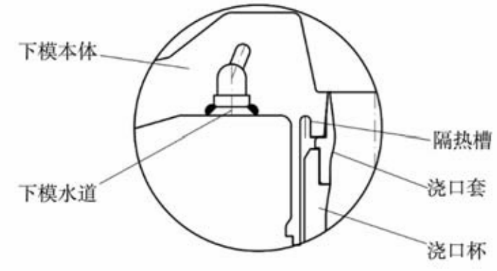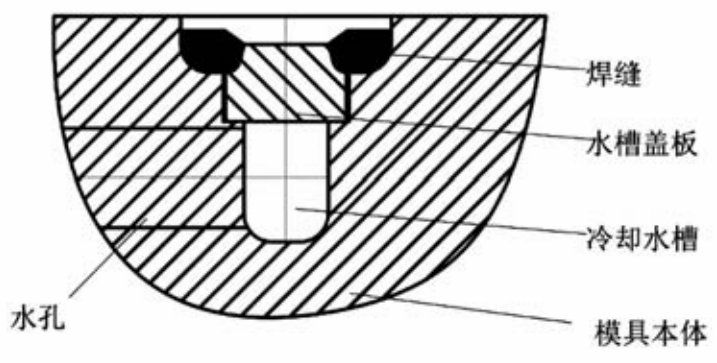 圖6 模具開裂 漏水的原因和對應措施主要有:①材料內部有缺陷,水道位置有渣孔、砂眼;措施:控制模具部件質量和檢驗,防止原材料缺陷導致漏水;②壁厚太薄,在水的激冷作用下開裂;措施:水道在設計時一定要保證安全壁厚;③水槽蓋板和焊縫結構不合理,達不到封閉效果;措施:設計時一定要保證足夠的封閉面和焊接面積,且焊縫不能高于工件表面以免碰傷;④焊接應力導致工件過早開裂;措施:工件在焊接后要去除焊接應力。開發新的水道加工方法,目前開始應用放電打孔工藝,避免在模具上開槽,極大程度上解決了漏水問題,但只能用于非整圈結構。 3.2 調節冷卻強度和范圍 直接冷卻強度速度快,激冷效果強,影響范圍大,必須對冷卻范圍進行調節,否則工藝很難控制。一般調節措施為增加隔熱槽,將不希望受冷部位隔離開,部分隔熱見圖7、整圈隔熱見圖8。