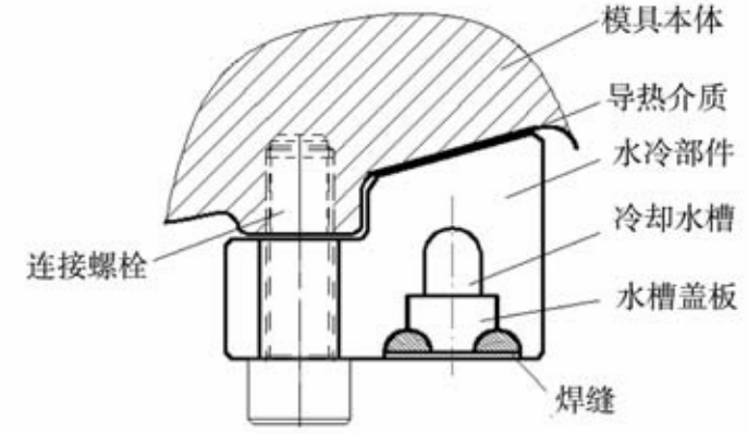 圖2 冷卻強度與流量關系 由于水冷結構復雜,模具加工成本高,工藝不易控制,各公司都對其投入大量人力物力進行研究開發,目前雖還不能完全取代風/水霧冷,但取得了一些進展,在實際鑄造生產中得到一定的推廣使用。 02 水冷的方式及結構 2.1 水冷的方式 由于水冷無法像風/水霧冷那樣直接將冷卻空氣噴射在模具表面后散射到環境中,必須有回收管路,所以水冷的結構較風冷復雜。通常的結構有兩種,即直接冷卻和間接冷卻。直接冷卻是直接在模具主件(上模、下模、邊模、中心)上加工水冷槽,開槽部位要保留安全壁厚避免開裂漏水(圖3);間接冷卻是制作水冷部件,貼緊在冷卻部位,并需要緊固,需要更大的空間;而且為達到更好地冷卻效果,需增加導熱介質(圖4)。