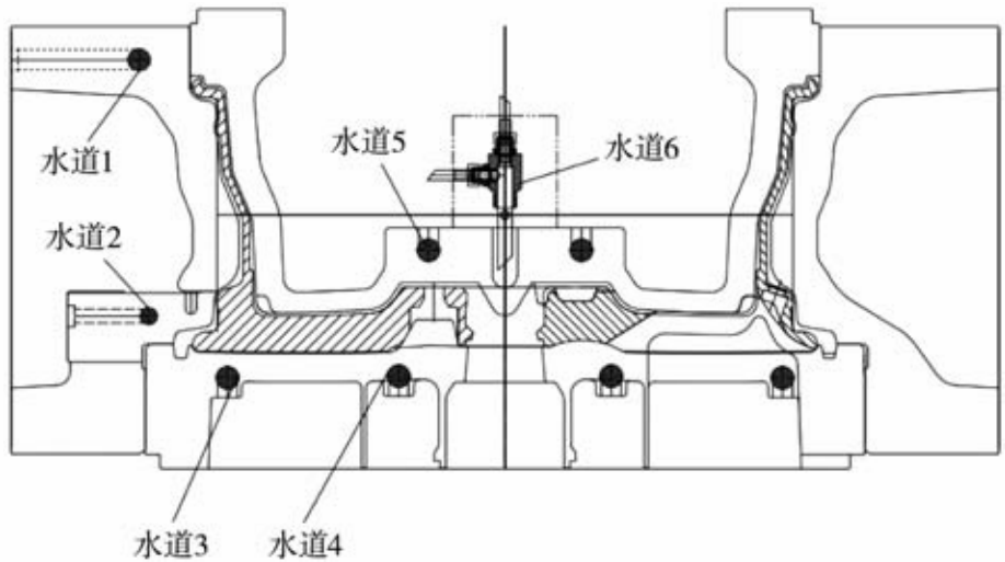 圖4 間接冷卻結構 直接冷卻強度大,模具溫度變化快;但增加了模具制作難度,一旦工藝調整或發生漏水維修困難,需更換整個模具部件;間接冷卻貼合部位對導熱性影響很大,甚至需要增加介質層來增加導熱性。間接冷卻可通過改變貼合部位或介質位置,靈活調節冷卻方位。 2.2 水冷的范圍 水冷的范圍有面冷和點冷兩種,面冷的冷卻區域較大,對模具溫度影響大;目前直接冷卻大多為面冷,適用于需大面積冷卻部位。面冷結合隔熱槽使用,也可控制冷卻區域;點冷冷卻區域小,冷卻位置更精準,工藝更容易控制;點冷的水冷結構部件數量增多,需要更大的空間,模具加工精度要求更嚴格,模具在制作和裝配上要求更高。 2.3 水冷的位置 水冷的位置一般在型腔末端、厚大熱節部位和需提升性能的部位,與風冷的布置原則基本一致,即保證鑄件的順序凝固。圖5水道1為型腔末端,普通低壓鑄件此位置較薄,不需額外增加冷卻可以保證最先凝固;鑄旋鑄件此位置較為厚大,一般設置直接水冷。水道2、水道3為輪輻與輪輞交接的熱節部位,較為厚大,易出現鑄造缺陷的位置,需設置直接水冷結合隔熱槽使用。水道4為下模對應鑄件輪心厚大部位,可根據產品結構采取直接或間接冷卻,由于鑄件螺栓孔的結構宜采用點冷。水道5為上模對應輪心厚大部位,由于背面減重窩結構宜采用間接點冷結構。水道6中心部位采用點冷。