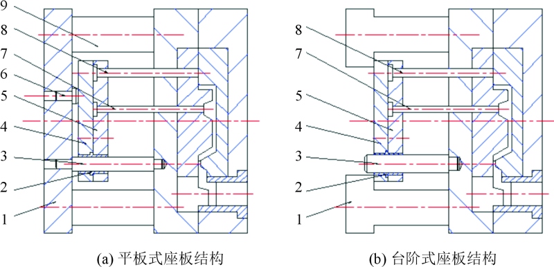 圖7 碟簧結構示意圖 動模推出機構的組成主要由推出元件、復位元件、導向元件、限位元件及結構元件,通常動模推出機構的結構組成見圖8。圖8a中推出機構的動模座板為平板結構,限位釘固定在動模座板上;圖8b中推出機構的動模座板為臺階式,與支板合為一體,同時內部臺階起到推出機構的限位作用。這兩種結構存在一個共性問題,就是當需要更換推桿或動模冷卻水等易損件時,必須拆卸動模座板。尤其是大型模具體積和質量大,并且連接螺栓尺寸大,拆卸動模座板的過程費時費力,嚴重影響生產效率。因此在復制模具時對動模推出機構進行優化。 離合器殼體動模推出機構的結構優化方案見圖9,動模座板采用一體式結構,裝配時首先將推板導柱安裝在動模座板的內臺階面上,推板導柱共4件分布在動模套板內腔四角處;定位銷安裝在動模座板與動模套板的結合面上。然后將帶有推板導柱和定位銷的動模座板安裝到動模套板上,用螺栓固定連接。之后將推桿、復位桿、推板導套按順序安裝在推板上,再用螺栓與推板固定為推出組件,將推出組件安裝到動模座板中;最后固定4個壓蓋式限位塊。維修維護更換易損件時,只需將4個小限位塊拆下,即可將帶推桿的推出組件取出,方便、安全、可靠。