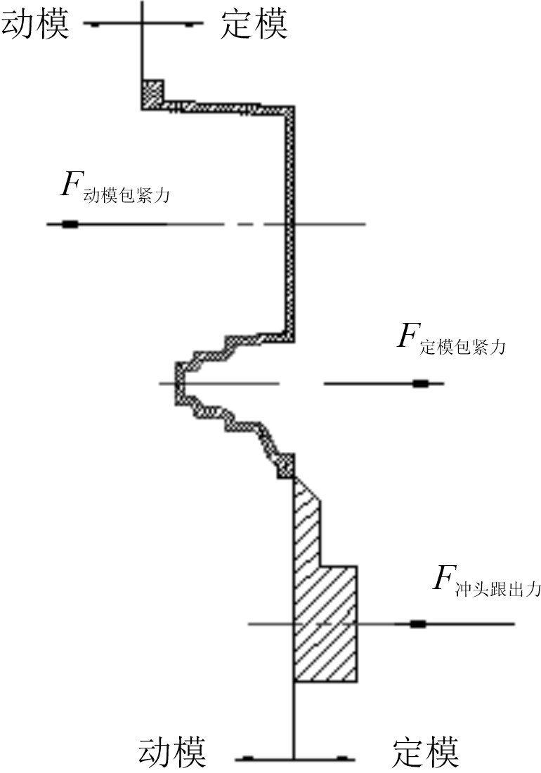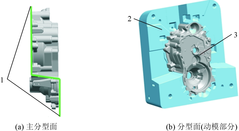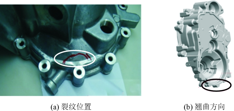 圖2 離合器殼體分型面 離合器殼體在批量生產時,存在變形及微裂紋缺陷,見圖3。鑄件毛坯變形約占報廢件的60%以上,變形位置發生在離合器殼體與變速器殼體的結合面,下部翹起1~2 mm,批量生產時依靠增大毛坯底面和側向孔的加工余量來抵消變形帶來的缺陷,造成很大的浪費;微裂紋發生的位置固定在下部的螺栓凸臺,無明顯痕跡,不良率小,發生階段為生產中后期。經分析,鑄件兩種缺陷均是因為鑄件的結構導致的包緊力受力位置及方向各異而產生的。模具在開模瞬間受力狀況見圖4,動模包緊力和定模包緊力呈上下分布,方向相反,開模瞬間動模包緊力強制將殼體脫離定模,盡管定模下方有沖頭推出力的作用,但由于內澆口處強度較低,在開模的瞬間沖頭跟出力將橫澆道與鑄件在內澆口處斷開,無法協助定模推出。模具使用初期,由于定模局部包緊力的作用致使鑄件發生變形。到模齡中后期隨著模具型腔表面出現龜裂,模具表面粗糙,定模局部包緊力加大,致使個別鑄件出現微裂紋。