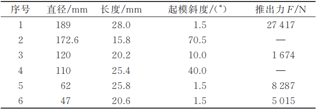 圖6 定模推出機構結構組成圖 從圖6b可以看出,定模鑲塊在中心成形區域為圓形臺階過渡形狀,主要由6部分凸臺組成,分別計算每部分的推出力,計算結果見表1。定模型芯總推出力∑F推=42 393 N。 碟簧具有體積小、負荷大、組合使用方便等特性,可以根據使用空間、負荷、行程等不同需求,通過單片對合組合、多片疊合組合等方式獲取不同的載荷和行程。在本模具定模推出機構中使用碟簧,可以在保證足夠的推出力的情況下有效地減小安裝空間,保證定模套板的強度。 依據本模具的定模推出結構,共設計兩處安裝碟簧的位置,處于定模推出機構縱向水平橫向中心對稱位置,見圖5,根據所需推出力,選用外徑為?50 mm,厚度為3 mm的碟簧兩片并聯使用。為滿足推出距離,選用6組串聯組合。選用的碟簧參數見表2。碟簧結構示意圖見圖7。 表1 定模型芯推出力