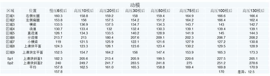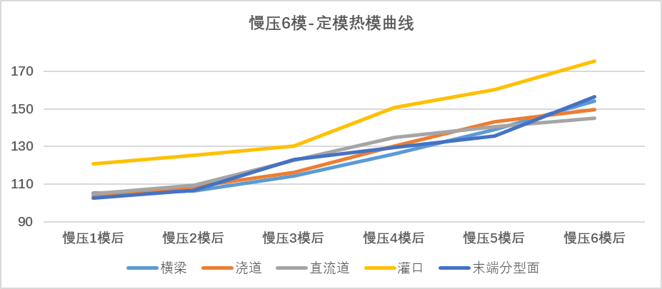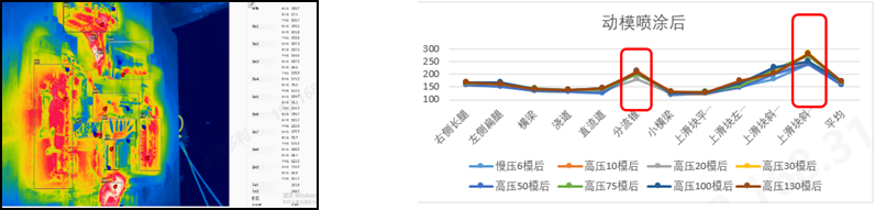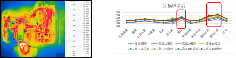 以上都是取的噴涂后的模溫: 慢壓6模后的模溫和100模后的模溫對比差異約18.5度 高壓件動模側溫度趨勢