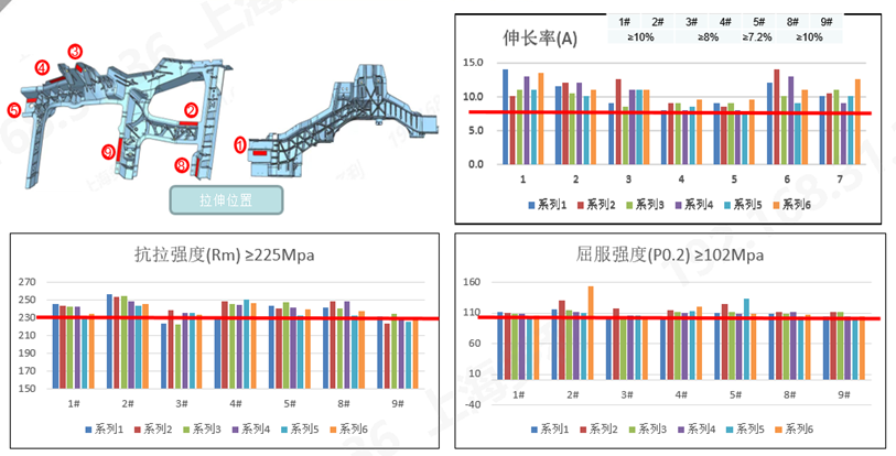 針對關鍵位置的的內部氣孔檢測,如輪罩區、中間橫梁區、門檻梁區等位置氣孔質量合格,未發現異常。 ③機械性能