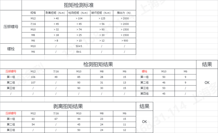 壓鉚螺母擰緊扭矩、剝離扭矩、破壞扭矩以及推出力都滿足標準要求。 綜合以上實驗結果: