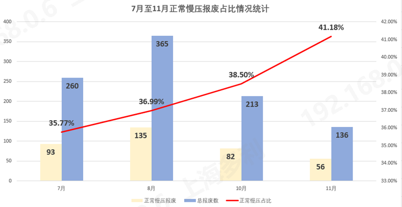 從優化的理論和實踐的結果可以看出,該優化是具備可行性的。 后續我們跟客戶進行了溝通,將實驗報告以及結論進行了匯報,得到了客戶的同意。 04 熱模慢壓件優化后報廢情況 從7月份至11月,生產零件數量29233件,報廢件數量共974件,其中熱模件報廢共366件,占比37.6%,較上半年減少20個百分點。