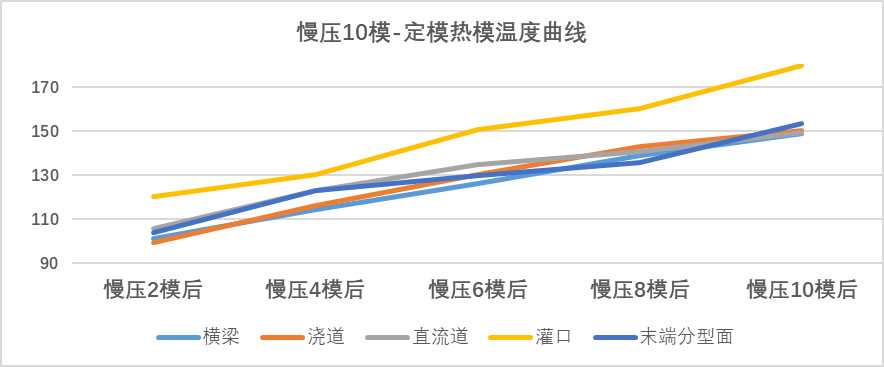 根據前期項目階段試模的結果以及模具狀態評估的經驗,熱模件數量定義原則是停機超過1小時需要生產10件熱模慢壓件。 慢壓定義的理論依據: 1.在壓鑄生產前,需要預先將模具加熱到一個合適的溫度,一般為澆注溫度的1/3,與壓鑄材料有關,一般為100-300℃。 2.模溫機定義熱模溫度為200℃,水溫機定義熱模溫度為130℃。 3.根據熱模期間模具溫度上升的情況,詳見下圖熱模溫度曲線,慢壓10模后各個區域的模溫可以達到工藝參數要求值范圍。