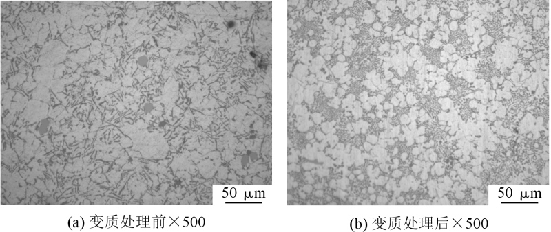 圖1 主軸承蓋支架三維示意圖 發動機主軸承座材質為ADC12合金,執行JIS H 5302:2006標準,材料化學成分見表1。其中Fe的含量較寬泛,Fe含量(質量分數,下同)低于0.6%時易粘模,高于1.2%會降低合金流動性和力學性能,影響鑄件質量,因此將Fe含量內控在0.6%~1.2%內。ADC12合金的抗拉強度為228 MPa,屈服強度為154 MPa,伸長率為1.4%,彈性模量為71 GPa。該材料具有良好的力學性能、切削性能和鑄造性能。 采用東大三建2.0 t/h鋁連續型熔化保持爐進行熔煉。投料時回爐料采用一類回爐料,質量小于總熔化鋁合金質量的40%。熔化時爐氣溫度設定為900 ℃,鋁液出爐溫度為720~770 ℃。鋁液出爐后倒入澆包,用精煉除氣機通氮氣進行精煉。精煉時,加入Al-10Sr桿,控制鋁液中Sr含量為0.03%~0.04%,在精煉出渣除氣的同時進行變質處理。圖2為變質處理前后ADC12合金金相組織。變質處理改變了合金的組織形態,枝狀結構轉變為球狀結構。細化后的組織均勻,無粗細晶粒交錯的混晶區存在,提高了材料的強度和伸長率。使用SPECTRDMX.06直讀光譜儀對精煉后合金進行化學成分檢驗,使用HZY-A220測氫儀進行密度值檢驗,使用“K模”進行含渣量檢驗,使用MXM-101手持式熱電偶對合金溫度進行檢驗,以上項目檢測合格才能轉至壓鑄機定量爐進行壓鑄生產。 表1 ADC12合金化學成分(%)
