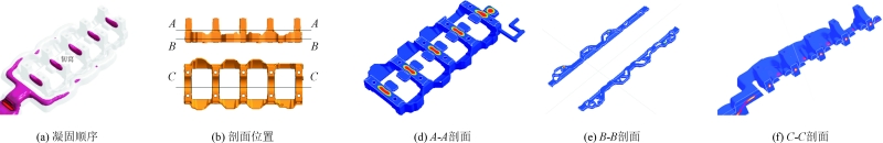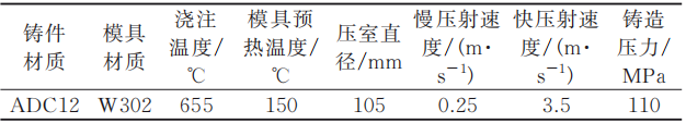 圖2 變質處理前后ADC12合金的金相組織 使用AnyCasting軟件進行CAE流場模擬數值分析。首先根據鑄件本身的結構特點,結合類似產品零件的經驗,設計壓鑄件的澆排系統,再通過不同的工藝參數進行多次模擬分析,在此過程中對橫澆道的形狀和內澆口的厚度進行優化,最終確定的工藝參數見表2。優化的模擬填充順序、填充速度結果見圖3。針對鑄件的開發難點即厚壁處可能出現的鑄造缺陷進行詳細的凝固收縮過程分析,凝固順序及收縮缺陷分析結果見圖4。 表2 壓鑄工藝參數