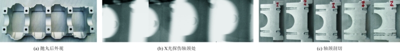 圖6 模具結構示意圖 主軸承座模具壓鑄生產的設備為ZDC-900TCS,配備史杰克西定量爐,鋁液溫度設定為(665±15) ℃。慢壓射速度為0.25 m/s, 快壓射速度為3.5 m/s,增壓壓力為110 MPa,射出增壓時間為10 s,冷卻時間為15 s。壓鑄過程采用自制真空系統,真空度達到10~20 kPa。在連續生產過程中監控模具型腔溫度,在(180±30) ℃工藝要求范圍內。壓鑄試生產500件,見圖7。可以看出,鑄件毛坯無冷隔、留痕、擦傷等外觀缺陷,鑄件毛坯去除澆口清理飛刺后進行拋丸處理,拋丸后鑄件見圖7a。試生產零件100%進行X光探傷,重點檢測主軸座軸頸位置內部質量, X光探傷結果見圖7b。同時抽取10件毛坯對軸頸處進行剖切,剖切面質量見圖7c。通過X光探傷結合剖切面質量分析,可見鑄件內無大于2 mm的縮孔縮松,內部質量符合客戶的要求并優于CKD零件;主軸承座5個軸頸處,第3軸頸(中間軸頸)和第5軸頸(最后填充)內部質量略差。