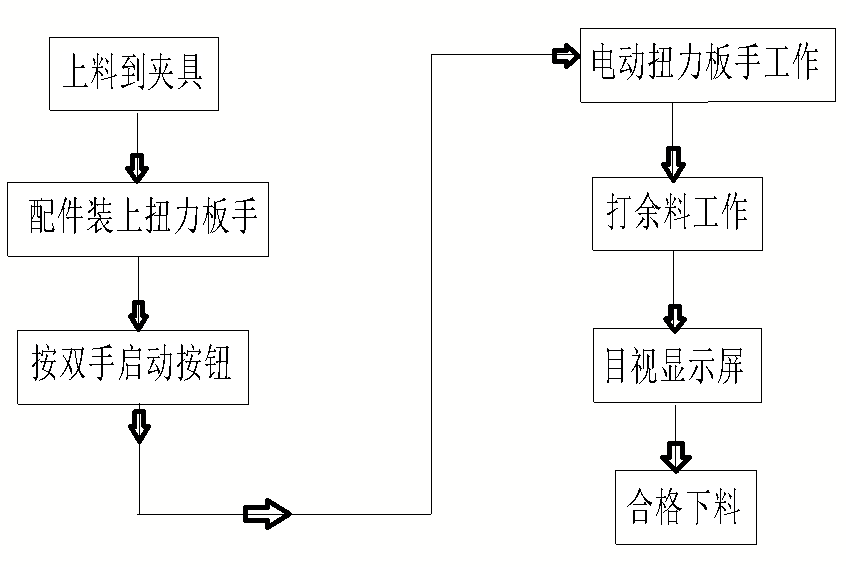 圖1 工作流程圖 圖2:為按照流程圖設(shè)計(jì)裝配機(jī)結(jié)構(gòu)示意圖。其工作流程如下:首先,當(dāng)人工將工件到裝配夾具時(shí),夾具感應(yīng)器的接近開關(guān),檢測(cè)到工件就位時(shí),并將信號(hào)傳給PLC控制系統(tǒng),自動(dòng)計(jì)數(shù),在計(jì)數(shù)顯示屏顯示工件的裝夾次數(shù)。每裝一個(gè)工件,顯示屏?xí)塾?jì)壓鑄件數(shù)量為1.2.3.4…….10000的疊加,并會(huì)存下當(dāng)天日期數(shù)據(jù);然后安裝螺紋襯套到裝配螺紋襯套工具處。按雙手開啟按鈕,電動(dòng)扭力板手自動(dòng)裝螺紋襯套,完成后電動(dòng)扭力自動(dòng)退出,然后用聯(lián)動(dòng)氣缸推動(dòng)除余料工具自動(dòng)除去余料,余料掉到對(duì)射式傳感器,對(duì)射式傳感器是光幕型光纖傳過器類似光柵[4],有物體通過光幕,傳感器便會(huì)產(chǎn)生電信號(hào)反饋到PLC進(jìn)行程序計(jì)數(shù)。便會(huì)產(chǎn)生電信號(hào)反饋到PLC控制系統(tǒng),計(jì)數(shù)器就會(huì)累計(jì)余料數(shù)量,并在余料計(jì)數(shù)顯示屏上顯示余料數(shù)量。自動(dòng)識(shí)別數(shù)量是否一致;當(dāng)所累計(jì)的工件數(shù)量和螺紋襯套除余料數(shù)量一致,機(jī)器不報(bào)警并合格顯示燈為綠色,并且夾具會(huì)自動(dòng)松開;若不一致,數(shù)量不一致顯示燈為紅色,并不可以松開夾具,數(shù)量不一致需要按復(fù)位按鈕并檢查正在裝配的工件。