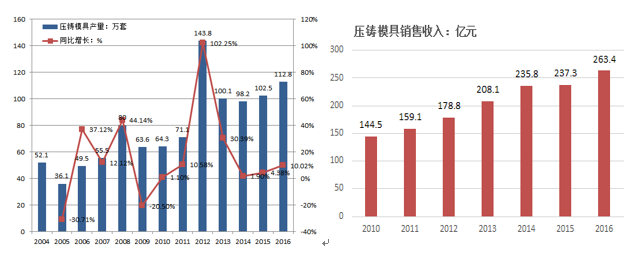 圖1. 2001-2020我國(guó)模具銷售額及增長(zhǎng)情況 壓鑄模具行業(yè)發(fā)展情況 壓鑄是在高壓作用下,使液態(tài)或半液態(tài)金屬以較高的速度充填壓鑄模具型腔,并在壓力下成形和凝固而獲得鑄件。我國(guó)壓鑄模具企業(yè)快速發(fā)展起步于上世紀(jì)90年代初,主要以摩托車配件壓鑄模具開始,進(jìn)入新世紀(jì)后,隨著中國(guó)汽車工業(yè)的快速發(fā)展,國(guó)內(nèi)部分龍頭壓鑄模具企業(yè)加大了先進(jìn)、大型裝備及先進(jìn)檢測(cè)設(shè)備的投入,以生產(chǎn)汽車支架、離合器、油底殼、手動(dòng)變速器等中型壓鑄模具為主,帶動(dòng)了全國(guó)壓鑄模具企業(yè)快速發(fā)展,模具制造水平及制造工藝大幅提升。目前,我國(guó)壓鑄件的產(chǎn)量早已居世界第一位,壓鑄模具開發(fā)周期、生產(chǎn)水平都有了顯著提升,壓鑄模在產(chǎn)量和產(chǎn)值上僅次于沖壓模及塑料模,已不僅能滿足國(guó)內(nèi)大型、精密壓鑄模具的需要,還能向歐美等傳統(tǒng)壓鑄模具強(qiáng)國(guó)出口。2016年我國(guó)壓鑄模具行業(yè)銷售收入為263.4億元,約占我國(guó)模具制造業(yè)總銷售收入的15%。圖2顯示我國(guó)壓鑄模具產(chǎn)量較2004年翻了一番,盡管產(chǎn)量(套數(shù))略有波動(dòng)(甚至下降),但總體銷售收入以9%的增速增長(zhǎng),顯示壓鑄模具正在經(jīng)歷產(chǎn)業(yè)升級(jí),往高端化、大型、精密壓鑄模具發(fā)展。