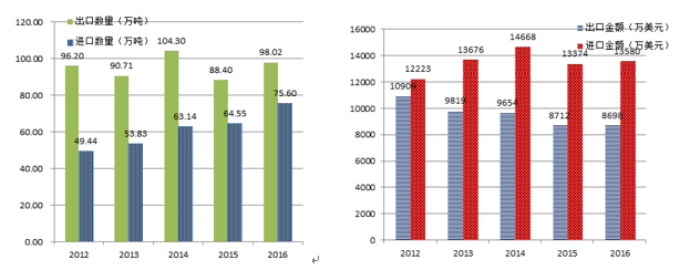 壓鑄模具出口情況 本世紀(jì)伊始全球模具市場(chǎng)開啟了新一輪增長(zhǎng),2005年全球模具市場(chǎng)規(guī)模為681億美元,2017年已超過1300億美元。當(dāng)前,我國(guó)壓鑄模具出口主要集中在歐洲、北美、日本、韓國(guó)等地,個(gè)別企業(yè)出口模具量已占總產(chǎn)值70%以上。伴隨著汽車工業(yè)的高速發(fā)展,與其相關(guān)的需求擴(kuò)大了發(fā)達(dá)國(guó)家向我國(guó)壓鑄模具市場(chǎng)的采購(gòu),使中國(guó)迅速成為全球汽車壓鑄模具需求增長(zhǎng)的新引擎,每年自用和出口壓鑄件超過500萬t。尤其是我國(guó)加入WTO后,開放力度加大,與國(guó)外合作頻繁,鑒于國(guó)內(nèi)人力成本的優(yōu)勢(shì),國(guó)外環(huán)保要求等諸多因素,大量壓鑄件已轉(zhuǎn)移到中國(guó)生產(chǎn),使國(guó)內(nèi)一部分壓鑄模具企業(yè)初步具備生產(chǎn)中等質(zhì)量及以上模具的水平。這些壓鑄模具的共同特點(diǎn)是:制作精良、精度極高、定制化設(shè)計(jì)、使用壽命和鑄件質(zhì)量達(dá)到國(guó)際先進(jìn)水平,同時(shí)具有較為明顯的價(jià)格優(yōu)勢(shì),但高端工業(yè)領(lǐng)域,大型、復(fù)雜、精密模具進(jìn)口需求仍然較高。圖3為2012~2016年我國(guó)主要壓鑄模具進(jìn)出口數(shù)量與金額。可以看出過去若干年我國(guó)出口模具的總數(shù)量遠(yuǎn)高于進(jìn)口,但以銷售收入計(jì)算的出口模具金額明顯低于進(jìn)口金額,體現(xiàn)我國(guó)整體出口模具的檔次和價(jià)格仍較進(jìn)口偏低。
