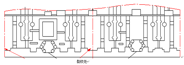 圖4:裂紋產生處 控制原材料質量 由金屬的遺傳性可知,原料鎂錠的成分決定了鑄件的質量。鎂錠的一系列缺陷,在鑄造后能遺傳給澆注后的鑄件。當原生鎂錠有裂紋缺陷時,澆注的鑄件會產生批次性裂紋缺陷,因此加強對原生鎂錠裂紋缺陷的控制可有效消除批次性裂紋缺陷的產生。 冷鐵位置 稀土耐熱鎂合金收縮大,凝固時受阻礙極易產生裂紋缺陷,裂紋一旦產生就會發展并貫穿到底,是一種致命缺陷,因此,造型時冷鐵間隙要足夠大,否則會阻礙合金的收縮而產生裂紋。一般冷鐵間隙不小于5 mm,圓弧面冷鐵要向心,防止后部相抵住。 4、熔劑夾雜的產生和防止 鎂合金熔煉中熔劑起著很重要的覆蓋和精煉作用,使用不當,會在鑄件澆注位置的下部、內澆口附近及死角處產生熔劑夾雜缺陷,是鎂合金鑄件的常見缺陷之一,主要來源于精煉劑及熔煉工具的洗滌劑。合金液靜置時間、熔劑的使用和澆注條件都會導致熔劑夾雜[4]。 鎂合金精煉后要有一定的靜置時間,將合金液精煉后靜置時間由20 min延長至30 min,延長靜置時間后,保證了熔劑能夠有充足的時間從合金液體中分離出去,鑄件的熔渣夾雜程度會得到明顯改善。 合金采用氬氣精煉,精煉熔劑用量取下限,僅用于覆蓋,減少熔劑用量;熔劑坩堝的溫度控制在800 ℃,使熔煉工具和升液管上的熔劑容易流下,這些措施都可以減輕熔劑夾雜缺陷的產生。 升液管距離坩堝底部要有足夠的距離,防止澆注時將熔劑吸入升液管而澆入鑄件。 5、氣孔的產生和防止 氣孔是殼體中常見缺陷。一般分為卷入性氣孔和侵入性氣孔,升液管使用情況、冷鐵質量、型砂透氣性、鑄型烘烤質量和澆注速度等因素都會影響鑄件氣孔缺陷的形成。 升液管使用情況 升液管經過多次使用,由于長期浸泡在合金液中會腐蝕,局部腐蝕過快會形成凹坑,隨著使用時間延長,凹坑會加深直至漏氣,因升液管漏氣而產生的氣孔較大,因此升液管在使用之前必須經過認真檢查,發現有凹坑要及時更換。 冷鐵品質 若氣孔出現在與冷鐵接觸的鑄件表面,則可能是冷鐵表面有油污或冷鐵表面未烘烤透造成的。冷鐵掛砂前要經過吹砂處理,掛砂后要烘烤透,未烘烤透的冷鐵表面掛砂發黃。對激冷面積過大的冷鐵可在表面開通氣槽,增強冷鐵在澆注時的排氣能力。 型砂透氣性和鑄型烘烤 控制原砂的含泥量,將原砂的粒度由70/140目調整為40/70目,提高型砂的透氣性;對鑄型進行兩次烘烤,提高鑄型的烘烤質量,這些措施可有效減輕鑄件表面氣孔的產生。 在實際生產中發現,在殼體的薄壁處,特別是當薄壁面積較大時,容易產生皮下氣孔,在X光檢查時呈黑色斑點,往往被誤判為熔劑夾雜。通過在薄壁位置的泥芯上開設淺的排氣槽,減輕了表面氣孔缺陷。 選擇合理的充型壓力 鑄件在澆注過程中常常出現卷氣等缺陷,主要原因是由于充填過程中充填速度過快而造成的。同時由于艙體內部結構復雜,鑄件突變壁厚也會引起液體流動瞬時速率不斷變化,加大了卷氣的可能性。降低充型速率可有效防止卷入性氣孔的產生。 三、結束語 (1)在鎂合金殼體低差壓鑄造中,對原材料、熔化工具、金屬液質量、熔化過程和細化精煉等每個環節須進行嚴格控制,保證金屬液合格,是生產出優質鑄件的前提。 (2)合理的鑄造工藝是解決鎂合金殼體低差壓鑄造缺陷的關鍵,可有效降低生產成本。