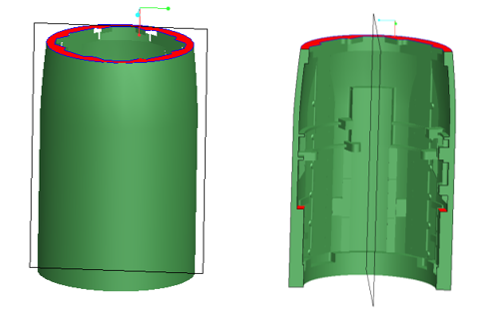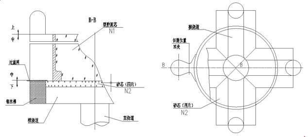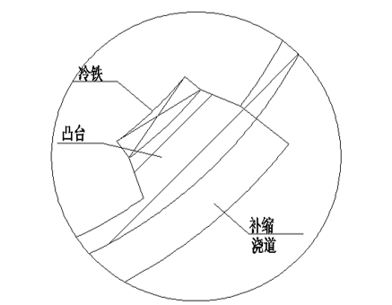 圖3:鎂合金殼體冷鐵布置示意圖 在工藝設計時,在凸臺部位一般都設置冷鐵加強激冷以減小熱節,但當凸臺過厚時容易產生疏松缺陷,即使增加冷鐵厚度也很難消除。在凸臺部位設計補縮澆道增加補縮,可有效消除疏松缺陷。 澆注溫度 降低澆注溫度可減輕鑄件過熱,有利于降低疏松等級,但不是溫度越低越好,溫度過低會降低補縮效果。一般情況下,當澆注大直徑立筒時可適當降低澆注溫度,澆注小直徑立筒時,澆注溫度要適當提高。 澆注工藝 在保證鑄型充滿的前提下,充型速度一般選下限,既可以避免充型時產生紊流、飛濺造成卷氣,又能延長金屬液對澆道的烘烤時間,從而調整鑄件凝固速度,強化順序凝固效果。根據生產經驗,升液速度要高于充型速度。 增加保壓壓力可以強化合金凝固期間補縮能力,從而填充枝晶間的微縮孔,但壓力過大會導致鑄件變形、粘砂和跑火等,因此壓力也不是越大越好,一般保壓壓力為30kPa~60kPa。 2、偏析的產生和防止 鎂合金的偏析一般是成分偏析,常會導致鑄件直接報廢。合金熔煉工藝和鑄件凝固條件都會引起鑄件產生偏析缺陷。通過調整精煉溫度、改善激冷能力以及降低澆注溫度,可有效降低偏析缺陷產生傾向。 精煉溫度 鎂合金熔煉過程中,相對鎂合金熔點高的其他金屬是重金屬。重金屬元素偏析的現象是由于重金屬元素未能完全融入合金液中,提高精煉溫度,重金屬元素能夠更好地熔入合金液中,鑄件中重金屬元素的偏析現象明顯減少。 激冷能力及澆注溫度 成分偏析易產生于厚壁冷鐵間隙處和厚壁間的薄壁處,在這些部位放置石墨砂加強激冷,減輕局部過熱可有效防止偏析缺陷的產生。降低澆注溫度,縮短合金凝固時間,降低合金過冷度,防止重金屬在凝固過程中析出,減輕了偏析的產生。在耐熱鎂合金殼體的生產中,降低澆注溫度,偏析缺陷得到了極大改善。 3、裂紋的產生和防止 裂紋是鑄件致命的鑄造缺陷,在鑄件上呈現直的或者曲折的隙縫與裂口,斷面處被氧化呈黑色或者深灰色,易產生在凸臺的厚薄交接處和下端框處,工藝設計、原材料質量和冷鐵位置都會導致裂紋缺陷。 工藝設計 當鑄件設計多個相鄰較近的凸臺時,見圖4,在凸臺間的薄壁處易產生裂紋缺陷。通過設計合理的防裂拉筋,可有效消除裂紋缺陷。