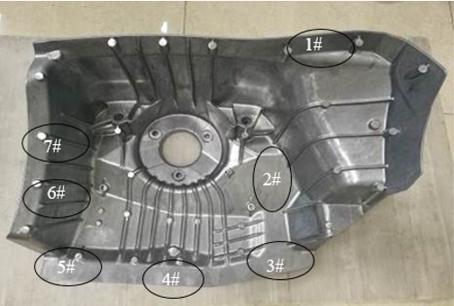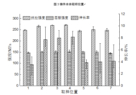 圖2:減震塔澆注系統設計 首次試制時,鋁液在壓鑄過程中順利充型,鑄件完整,表面無明顯缺陷,基本達到首次試制目標。對減震塔進行本體取樣,用WDW3200型室溫拉伸試驗機進行力學性能檢測,每個位置進行5組測試,拉伸速率為2 mm/min;采用OLYMPUS GX51金相顯微鏡、SEM(JEOL JSM6480型掃描電鏡)對減震塔取樣部位及拉伸斷口進行微觀組織形貌觀察。 性能檢測及分析 為研究減震塔鑄件的力學性能,進行本體取樣,取樣位置及編號見圖3。取樣位置涵蓋近澆口、遠澆口、鑄件中部及型腔內鋁液流動方向激變區,這些區域的力學性能可以代表減震塔鑄件的整體性能。 不同取樣位置的壓鑄態力學性能見圖4。對比可知,2號、3號、4號位置的平均抗拉強度均超過265 MPa,最大值為271 MPa,其他位置的平均抗拉強度則在250 MPa以下,最小值為247.5 MPa;所有位置的平均屈服強度相當,均在150 MPa左右,且波動較小,每組試樣測試差值在7 MPa以內;2號、3號、4號位置的平均伸長率在8%左右,最大伸長率為9.11 %,滿足設計要求,而其他位置的平均伸長率在4 %左右,其中1號位置伸長率最低,僅為1.78 %,遠低于要求的壓鑄態伸長率5 %以上。 影響鑄件抗拉強度和屈服強度的因素主要有基體強度、晶粒尺寸、第二相數量和分布等。由于檢測位置的材質相同,凝固溫度和冷卻速度基本一致,使得所有取樣位置的強度值基本相當。此外鑄造缺陷會影響鑄件的抗拉強度,但對其屈服強度影響不大,2號、3號、4號位置的抗拉強度高于其他位置,可能與本身鑄造缺陷較多有關。 對壓鑄件來說,除了材料本身,伸長率的好壞主要與鑄造缺陷有關。2號、3號、4號位置的伸長率顯著高于其他位置的伸長率,可能與這些部位的鑄造缺陷較少有關。這與抗拉強度分析的結果一致。