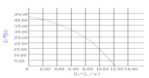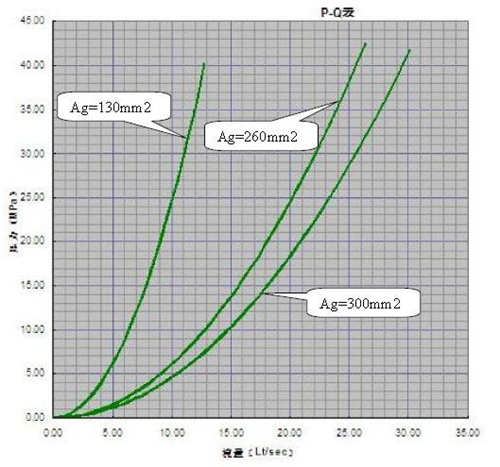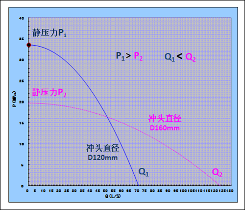 圖11:儲能Acc壓力對P-Q圖的影響 3、調整沖頭直徑 由式(2)可知,沖頭直徑和金屬靜壓力成反比關系,和流量Q成正比關系,如圖12所示。