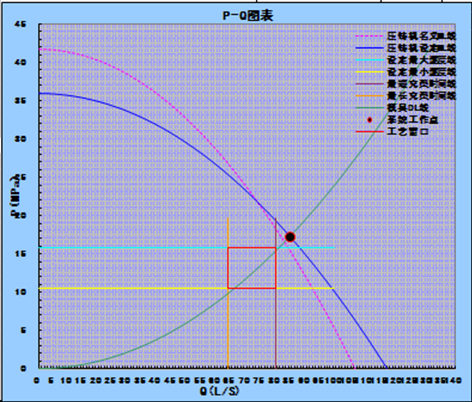 (10)式中,A為沖頭截面積,mm2;G為鑄件及渣包重量,g;ρ為鋁液密度,g/cm3,取2.64g/cm2;ν為速度,m/s; t為填充時間,s。 沖頭直徑的選擇 根據5.1、5.3、5.4.1中的參數,同時初步擬定壓射速度為4.5m/s,由式(10)可知沖頭截面積約為15840mm2,即沖頭直徑約為?142mm,故取沖頭直徑為?140mm。 六、用P-Q圖驗證濾波器腔體的模具設計及優化壓鑄工藝 依以上案例鑄件、模具及壓鑄機的相關參數,可將式(2)和式(6)做出以下P-Q圖,如圖16所示。